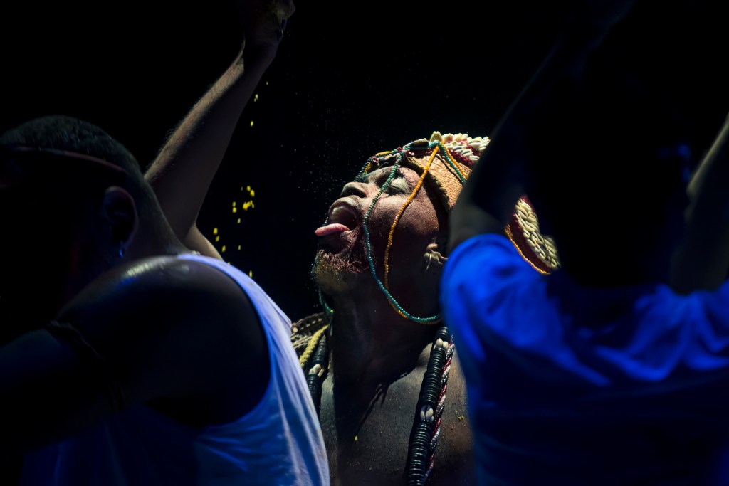 Colocar o próprio corpo na dimensão de ebó, com a magia do gesto, é criar um portal entre múltiplas existências que atravessam o passado, presente e futuro. É como comer, mastigar, engolir, gozar e devolver ao mundo transformado em uma dança que se apoia na força embrionária de Exú para alavancar desejos de uma vida doce.